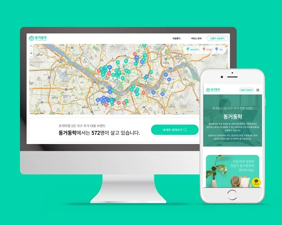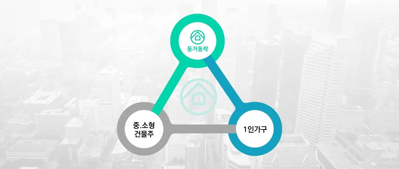 동거동락은 국내 최대 1인 주거 검색 플랫폼(주거서비스)을 기반으로, 1인 가구에게는 합리적으로 살기 좋은 주거지를 제공하고, 건물주들에게는 부동산을 쉽고 편리하게 관리할 플랫폼과 연계된 서비스를 제공하고 있습니다.